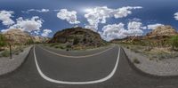 a view from a 360 - angle to a scenic empty road with rocks and shrubs