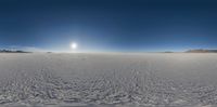 a wide view shows the sky and land from within a 3d globe lens view of snow covered ground