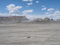 Off-road track in the open spaces of Utah's Factory Butte desert. The dirt and gravel surface blends seamlessly with the natural landscape. Clouds dot the sky on a sunny day.