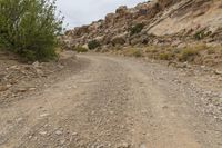A gloomy day in San Rafael Swell, Utah. The grey sky contrasts with the red rock landscape and sandy desert. A gravel road leads straight into the canyonlands, offering a unique off-road experience.