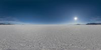 a panorama of snow and mountains in a desert field with clouds and sun shining through the sky