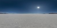 snow covered ground with a clear sky in the background of a full moon over a mountain range