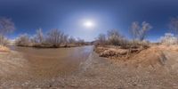 a river and a clear blue sky in a panoramic view of the desert