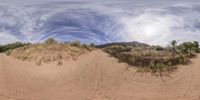An elevated view of a dirt road in Utah's Cedar Mesa region. The road stretches straight through the low-lying grass and sand, surrounded by stunning red rock formations. A striking perspective of the majestic Canyonlands.