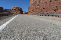 A scenic road in Utah winds through stunning red rock landscapes. The yellow lines contrast with the vibrant rock formations. This highway showcases the unique geology of the region, including the famous Canyonlands and Lake Powell.
