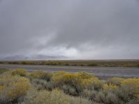 This image captures the essence of the natural environment in Utah, USA. The landscape showcases a high plain surrounded by grass and trees. The road, made of asphalt, cuts through the plain and leads to Salt Lake City. The grey sky indicates the possibility of rain and hail, enhancing the scenery. The wet surface reflects the elevated water level from recent precipitation. This photo represents a typical day in Utah, where nature and the urban area coexist harmoniously.