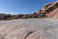 This image captures the rugged beauty of the Needles District in Canyonlands National Park, Utah, USA. The clear sky provides a stunning backdrop for the red rock formations that dominate the landscape. The rocky surface is a mixture of dirt, gravel, and bedrock, showcasing the unique geology of the area. The Needles District is known for its wild and untamed nature, with canyons, outcrops, and fault formations adding to its charm. This photo represents the untouched wilderness of Utah's stunning desert landscape.