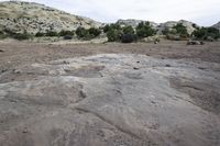Rugged landscape of the San Rafael Swell in Utah. Red rock formations and grassy outcrops contrast with the open desert. A lone dog sits atop a bedrock formation overlooking the vast expanse.