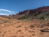 A picturesque landscape of open space in Utah. Highway 12 carves through the dirt and gravel surface, surrounded by stunning nature. The clear sky and clouds overhead create a perfect day for a scenic drive.