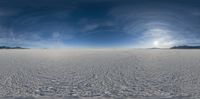 Snow-covered open space in Utah, surrounded by majestic mountains. The clear sky and sunshine create a stunning landscape. In the distance, the sun is visible, casting a large circle in the sky. A beautiful dawn in the desert.