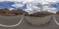 360 - ball image of a paved road passing between cliffs and grass field with clouds