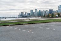 A grey sky hangs over a parking lot in Vancouver, Canada. The empty asphalt road and open space create a sense of tranquility. A typical day in this Canadian city.
