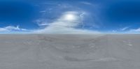 Endless salt flats under a sunny sky create a serene desert landscape. Visible sun casts its warmth over the vast open space. Cloud-laden skydome enhances the beauty of this unique natural environment.