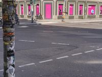 Urban scene in Berlin, Germany. Colorful graffiti adorns a pole at the intersection, while a pink door and sign stand out in the foreground. Vibrant city life in a residential neighborhood.