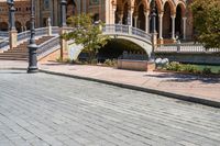 This stock photo captures a beautiful view of the steps and sidewalks in front of an ornate building in Seville, Spain. The timeless architecture of this city is on full display, with classic architectural elements and a touch of urban charm. The image perfectly captures a sunny day in Seville, where nature blends seamlessly with the city vibe. The steps lead to a castle-like structure, reminiscent of a museum or a recreational spot. The surface design is intricate and eye-catching, adding to the overall charm of the scene. This is a must-have image for any collection focusing on the beauty of Seville and classic architecture in Spain.