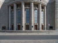 Classic architecture of the Volksbühne theater in Berlin, Germany. Urban design meets clear skies in the heart of the city. Asphalt roads lead through the bustling urban landscape on a typical European day.