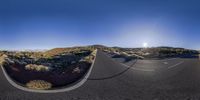 a photo taken with the fisheye lens while looking at a winding road below it