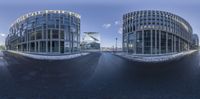 A panoramic view of a snow-covered street in a metropolitan area. The buildings, with their symmetrical facades, stand tall against the clear blue sky. The urban design and architecture create a striking contrast against the white winter landscape.