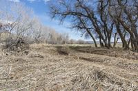 This scenic stock photo captures a winter road surrounded by low grass, woody plants, and trees in Denver, Colorado. The path curves through the snowy landscape, with clear skies and a few clouds overhead. The off-road track is covered in gravel and soil, providing a natural environment for recreational activities. The image showcases the rural beauty of Denver in winter, with shadows cast by vegetation and a hard shadow indicating the low sun. The grass surface adds texture to the scene, making it a perfect depiction of the Colorado countryside.