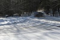 A picturesque winter landscape in Canada with a snow-covered road surrounded by trees and vegetation. The road, covered in tire tracks, leads through a forest of tall trees with branches covered in snow. The clear blue sky above adds to the serene atmosphere. This scenic route is elevated and offers stunning views of the surrounding nature. The freezing temperatures have created a high slope, making it a challenging path to travel. This image captures the beauty of the wintery scenery near Toronto, showcasing the natural beauty of Canada in all its glory.