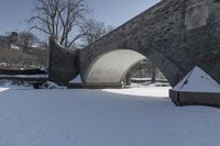 This stunning winter landscape photo captures a person walking through the snow in Toronto. The scene showcases an arched bridge over a frozen lake, surrounded by beautiful buildings and an open space. The clear sky and the tints and shades of the winter season add a touch of magic to this rural setting. With the autumn trees and the snow-covered surface, this image depicts the beauty of nature and the freezing temperatures that define winter in Canada.