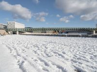This beautiful stock photo captures the stunning winter scene of Berlin city. A majestic bridge spans across the snowy river, with boats parked on it. The urban design of the city is showcased, with snow-covered roads and cloud-filled sky. It is a perfect depiction of a winter day in Berlin, where water and urban elements blend harmoniously.