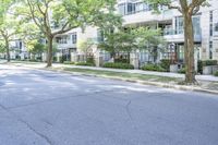 This photo shows a young boy skillfully riding a skateboard on the smooth asphalt road in a residential area of Toronto, Ontario, Canada. The modern architecture of the surrounding buildings creates a beautiful backdrop for the scene. The boy seems fascinated by the urban design and city life as he looks towards the tall buildings. The tree-lined street and the shadow cast by one of the houses add to the overall charm of this suburban neighborhood, making it an ideal place for families looking for a peaceful and yet vibrant human settlement. The image captures a perfect moment of public space and showcases the beauty of real estate in Toronto.