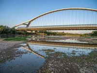 A modern bridge in Zaragoza, Spain reflecting the clear sky at dawn. The bridge spans over a river, creating an open space with a view of the city's modern architecture. The dirt and gravel surfaces add an urban touch to the scenery.