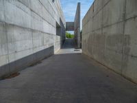 the empty parking lot in front of a wall with apartment buildings on it and a skateboarder on a ramp