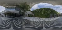 Aerial view of a modern office building in Zaragoza, Spain. The circular architecture and open courtyard create a unique urban space. Hedges and stairs adorn the entrance area, adding a touch of green to the concrete surface.