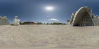 Aerial view of Zaragoza in Spain showcasing modern architectural marvels. Straight down the road, an open plaza with a clear sky backdrop. Shadows cast by elevated buildings create a dramatic effect on the surface below.