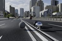 Tokyo's urban landscape featuring a modern bridge with Armco barriers. The cityscape under a clear sky showcases the sleek architecture. Asphalt road leads straight, creating a futuristic skyline.