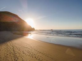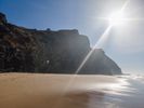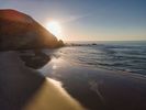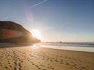 Experience the breathtaking beauty of Portugal's coastline. From a high position, the aerial views reveal expansive beaches, clear skies, and the shimmering ocean. The sun casts a warm glow over the sand, creating an inviting landscape that epitomizes Europe's coastal charm. Open spaces and the water's surface stretch into the horizon, offering a serene and picturesque setting.