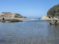 A stunning view of California's coastal landscape, with sandy shores, crystal clear water, and a beautiful tree on the bedrock cliff.