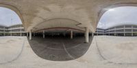 A high-rise building with beige-colored architecture stands tall in the urban cityscape of Toronto, Ontario, Canada. The concrete walkway and handrail lead to an elevated open space, providing a scenic view of the city. The parking deck below and the bridge over the water add to the bustling urban atmosphere.