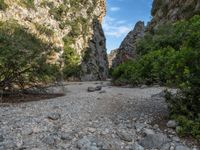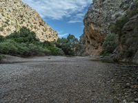 In the heart of Majorca, the Balearic Islands offer a stunning landscape with rocky walls and canyons casting shadows under the European sun. Gravel and dirt surfaces define the open spaces, creating a natural canvas for the play of light and shadow. The walls stand tall, showcasing the beauty of Spain's rugged terrain against a backdrop of clear skies and fluffy clouds.