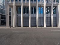 A view of a modern office building on a Berlin street, looking straight down the road and set against the backdrop of a business district in Germany, Europe.