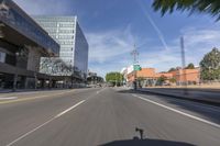 A view of the asphalt road in Los Angeles, California, USA, with the cityscape and high-rise buildings in the background. The motion blur of passing vehicles adds a sense of speed and urban energy to the scene.