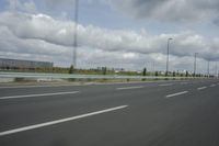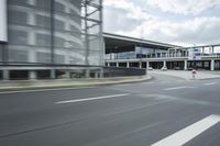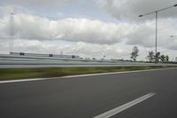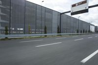 Modern architecture and industrial infrastructure are seen in the business district of Berlin, Germany. A guard rail, Armco barrier, and plane are visible in the foreground, while a highway, residential area, and woody plant can be seen in the background.