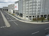 A view of modern architecture, road surfaces, and infrastructure in the metropolitan area of Berlin, Germany, seen from an airplane window.